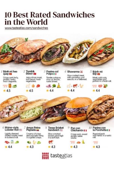 El ranking de los 10 primeros se completa con; 4) Panino Col Polpo de Italia, 5) Shawarma del Líbano, 6) Sándwich Bánh mì de Carne y Embutidos de Vietnam, 7), Sándwich de Rollo de Langosta Maine de Estados Unidos, 8) Arepa Reina Pepiada de Venezuela, 9) Texas Brisket Sandwich de Estados Unidos y 10) Pan con Chicharrón del Perú.