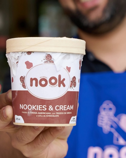 De hecho, el nombre NOOK apunta a eso. Más que un gelato tradicional, lo nuestro se acerca a un ice cream cremoso e indulgente. El Doble Manjar Chips, por ejemplo, lleva dulce de leche argentino y va veteado tanto con chocolate como con manjar, logrando una mezcla profunda y reconfortante.